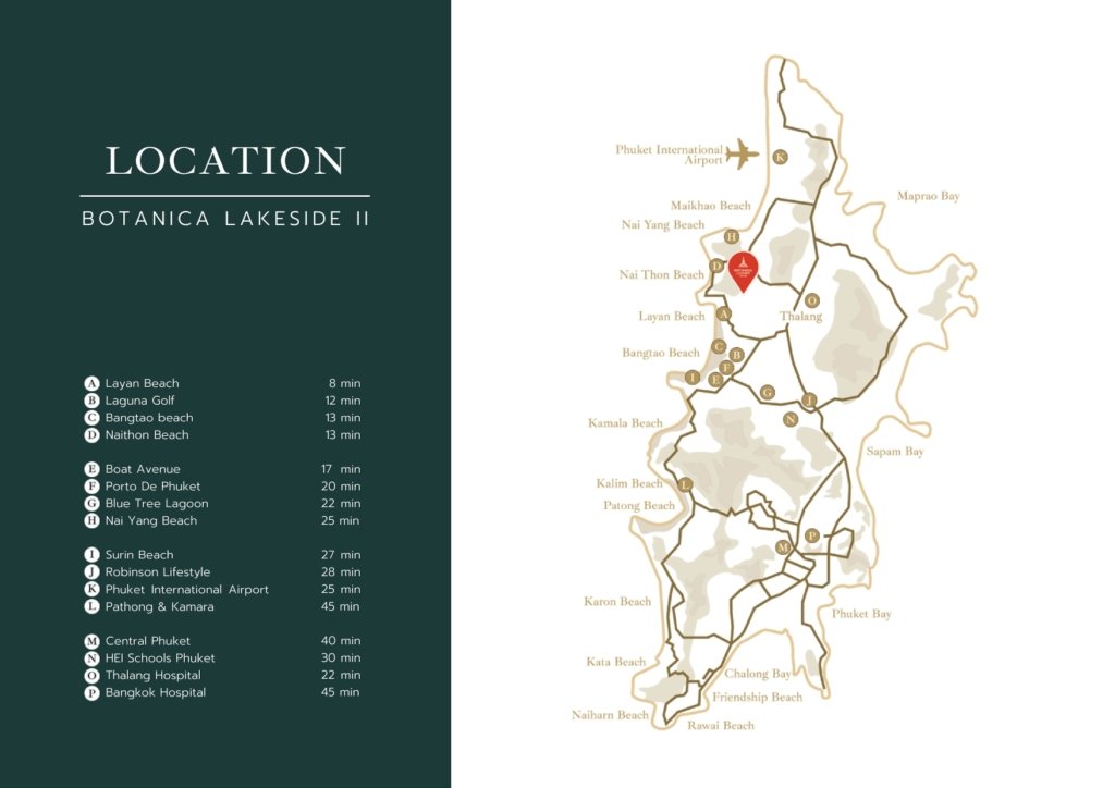 Layan attracts upscale residential developments due to its tropical charm and excellent location. Layan Beach is just 5 minutes away, and Laguna Phuket is only 10 minutes by car. Dining and shopping spots like Boat Avenue are a quick 12-15 minute drive, as is Porto de Phuket mall. The prestigious UWC international school and the Thanyapura sports complex are accessible within 25 minutes. Golfers will love the nearby Laguna Golf, only 10 minutes away, and Blue Canyon Country Club, home to two famous 18-hole courses, about 30 minutes by car.